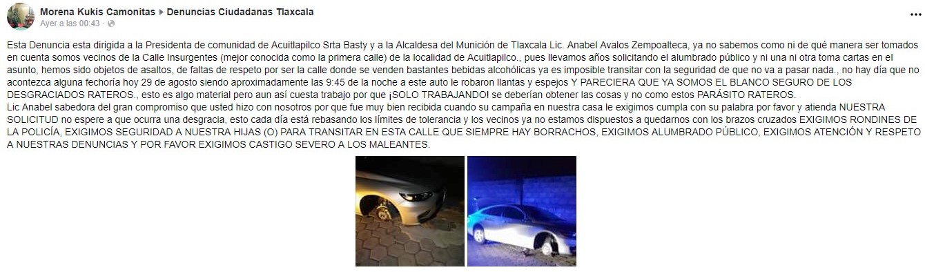 Tras el botín que obtuvo la conocida banda de robo de autopartes en días pasados de los vecinos de Acuitlapilco, ciudadanos exigieron a la presidenta municipal Anabell Ávalos Zempoalteca que cumpla con su palabra empeñada en campaña y cesen los ilícitos que en los últimos meses han incrementado.