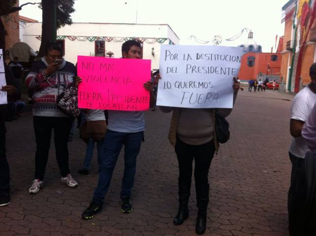 A raíz de que el presidente municipal de Tocatlan, José del Carmen Hernández, se involucró en una pelea campal contra pobladores que participaban en una celebración religiosa el pasado fin de semana, la cual se originó por un percance automovilístico, este viernes habitantes de esa región, se manifestaron frente a Palacio de Gobierno para exigir la destitución del munícipe.