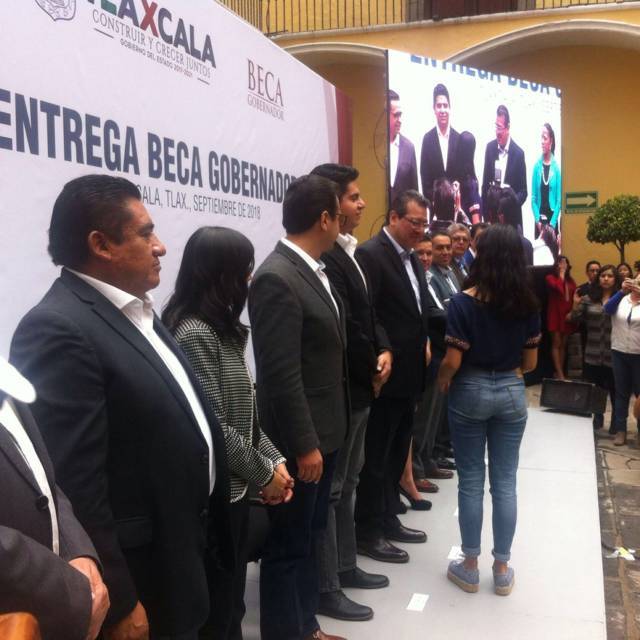 En el patio central de Palacio de Gobierno, en un evento protocolario 28 jóvenes tlaxcaltecas recibieron la Beca Gobernador, que consiste en un apoyo de mil dólares para estudiar licenciaturas, maestrías, doctorados y especialidades en el extranjero.