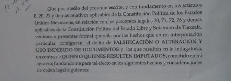 De esta manera, Alicia Caballero Yonca, denunció ante las autoridades correspondientes falsificación o alteración y uso indebido de documentos, pues el grupo que se autodenominó, pacífico, ha dado a conocer en redes sociales una serie de nóminas, en donde específicamente ella percibía supuestamente en la nómina de Ixtenco, ingresos de hasta 35 mil pesos mensuales como asesor jurídico de dicho ayuntamiento, sin embargo este día acudió a la agencia del ministerio público a denunciar en contra de quienes resulten imputados de los agravios en su contra.