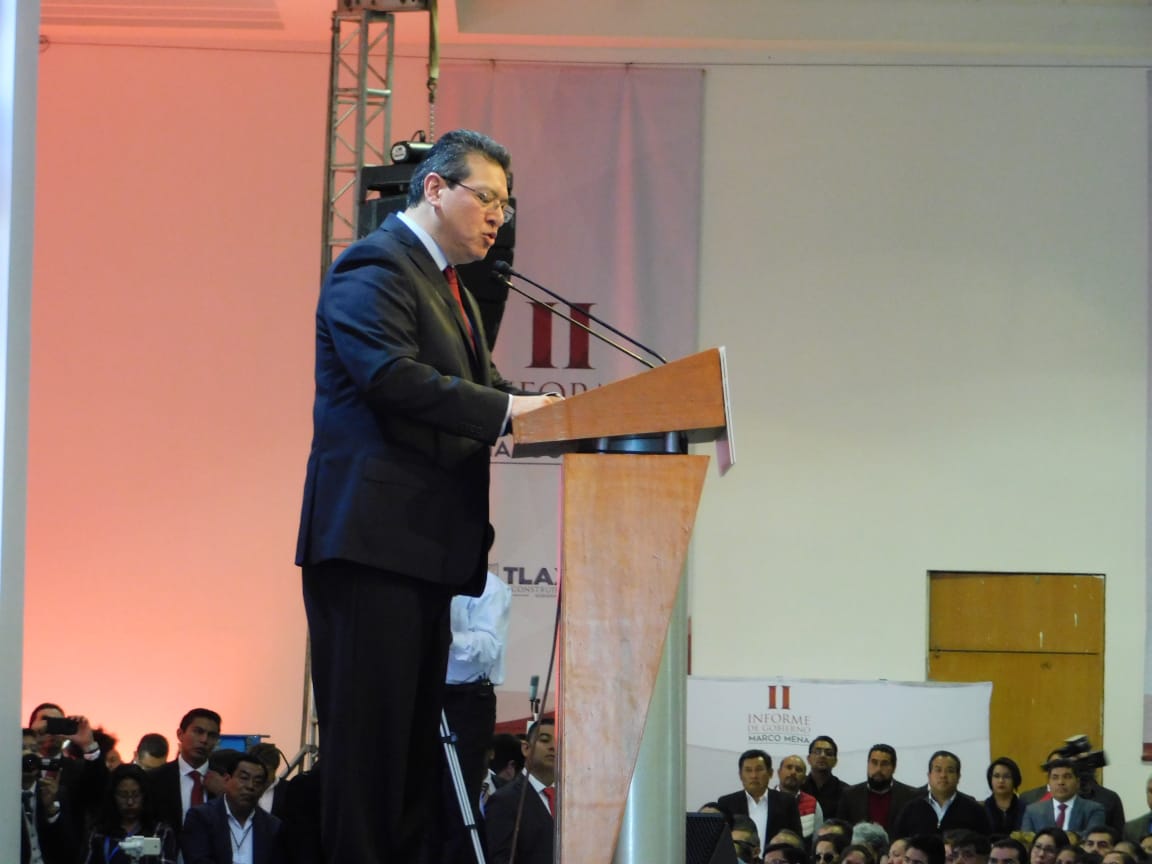 Con la presencia de dos gobernadores y de dos funcionarias federales que estarán en Tlaxcala desempeñando labores del nuevo gobierno, dio su Segundo Informe de Gobierno, Marco Mena Rodríguez tras asumir el poder en enero de 2017.