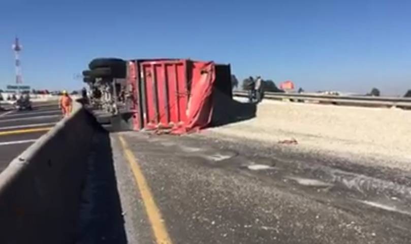 Sería la falta de precaución y el exceso de velocidad la razón por la que el conductor de la pesada unidad que transportaba materiales para construcción, perdió el control y terminó con el tractocamión volcado.