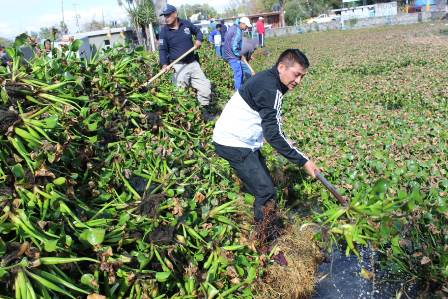 El presidente municipal, Lic. Alfredo Valencia Muñoz, encabezó la faena de este viernes en "La Presa" con el fin de retirar el exceso de lirio acuático, así como residuos sólidos que se arrojan en este espacio natural.