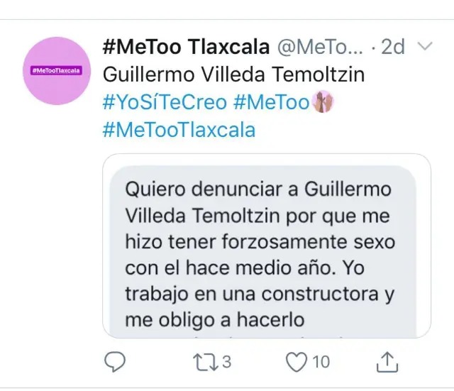 “Quiero denunciar a Guillermo Villeda Temoltzin porque me hizo tener forzosamente sexo con él hace medio año. Yo trabajo en una constructora y me obligó a hacerlo presumiendo que si no lo hacía le hablaría a mi jefe para que me corriera y no bastándole, también me amenazó diciendo que su cuñado es diputado y si él quería me dejaba sin trabajo en todo el estado”, dice Metoo.