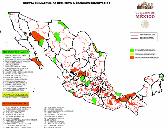 "Estas serán las futuras 45 regiones prioritarias, aquí están, reforzamiento en marcha, luego por iniciar, y luego las propuestas para próximo inicio en forma paralela al reclutamiento de nuevo personal", dijo Durazo.