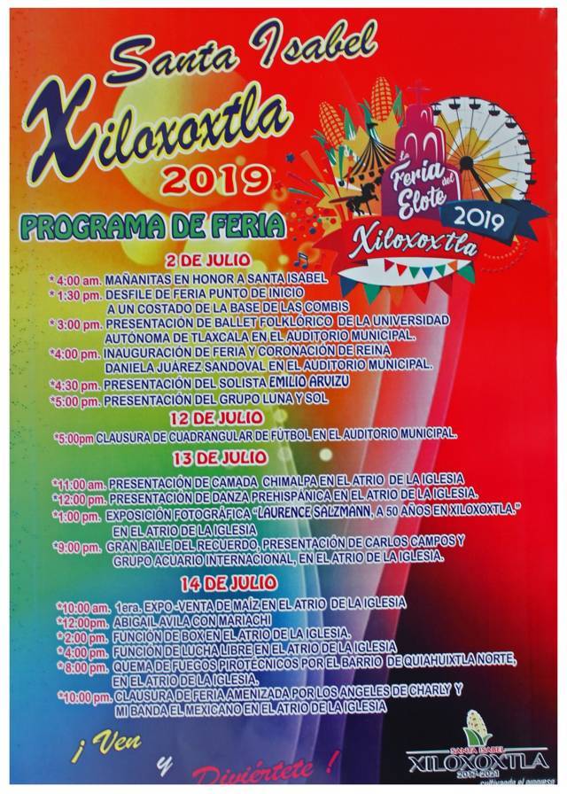 El presidente municipal Jaime Pérez Juárez dio a conocer el cartel de la próxima “Feria del Elote Xiloxoxtla 2019”, la cual dará inicio este 2 de julio y finalizará el día 14, donde dijo esta festividad que cada año atrae a miles de visitantes se realiza en honor a nuestra santa patrona Santa Isabel, dicha feria es un legado que nos heredaron nuestros ancestros y donde damos a conocer nuestras tradiciones y costumbres y donde habrán eventos para toda la familia tanto religiosos, deportivos, culturales, el tradicional baile, la 1er expo-venta del maíz, por mencionar algunos.