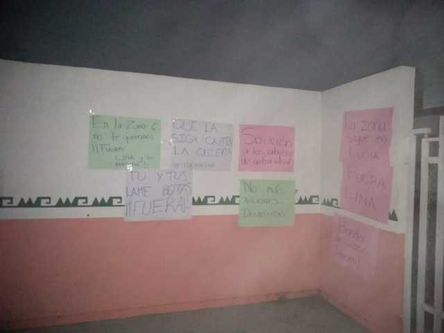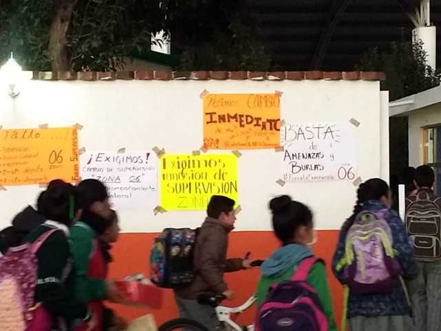 Los paterfamilias pegaron unas pancartas en la barda de la institución educativa, acusando a la servidora pública de actuar con amenazas, incurrir en acoso laboral, abuso de autoridad y represión, pidiendo a las autoridades que actúen en consecuencia.