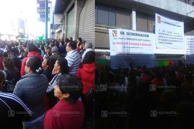 Derivado del despido de dos trabajadores adscritos a las Oficinas Centrales de la Secretaría de Salud (SESA) y por no cumplir con los caprichos de la dirigente de la sección 27 del Sindicato Nacional de Trabajadores de la Secretaría de Salud (Sntsa), Blanca Águila Lima, personal agremiado a este sindicato acudió la mañana de este martes a la sede de la dependencia en Tlaxcala para exigir la salida de la directora administrativa de este organismo, Guadalupe Zamora Rodríguez.