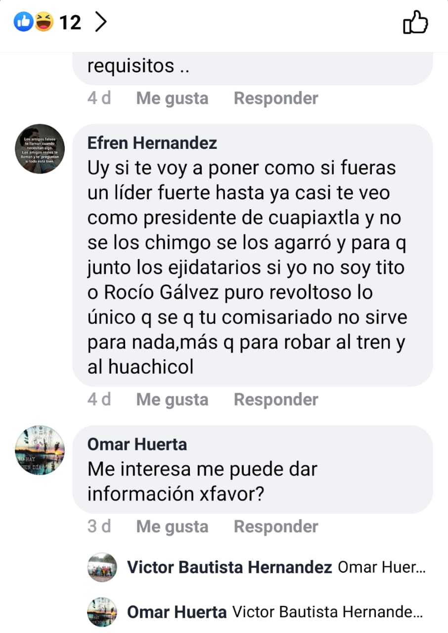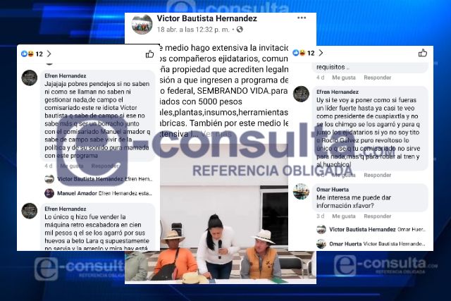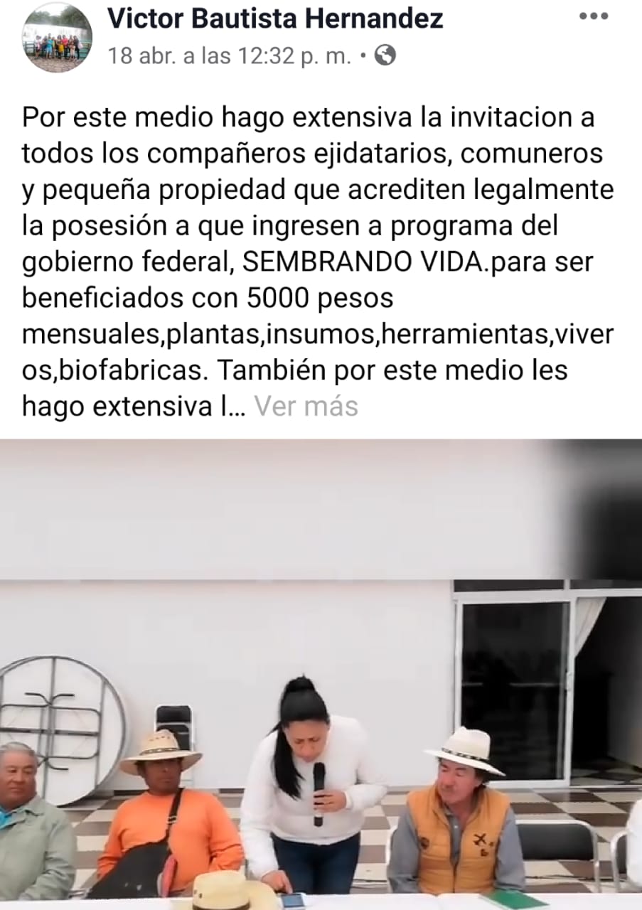 Incluso en redes sociales, uno de sus operadores cercanos de nombre Víctor Bautista Hernández, hace la invitación de manera directa a ejidatarios y comuneros para ingresar al programa “Sembrando Vidas”, el cual otorga un apoyo de cinco mil pesos mensuales a los beneficiarios de este apoyo que sirve para la reforestación de los bosques en el país.