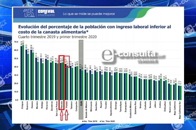 Los datos publicados por el Consejo Nacional de Evaluación de la Política de Desarrollo Social (Coneval) que corresponden al último trimestre de 2019 y al primero de 2020, muestran que la capacidad de los tlaxcaltecas para adquirir la canasta básica es una de las más bajas en el país, ubicandose sólo por detrás de estados como Chiapas, Guerrero, Oaxaca, Morelos, Hidalgo, Veracruz y Zacatecas.