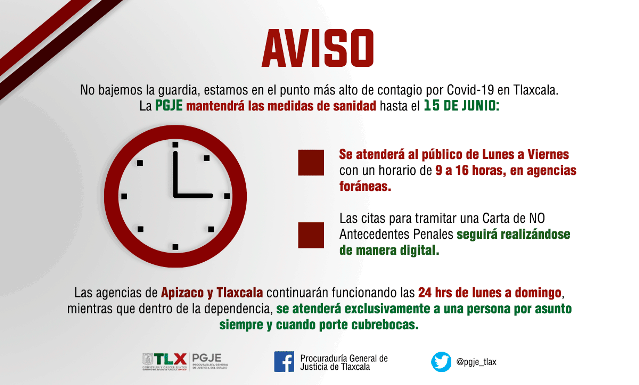 Además, todas las agencias del Ministerio Público permanecerán abiertas de 09:00 a 16:00 horas y cuentan con la información preventiva necesaria para mantener una sana distancia, así como material para la limpieza de manos.