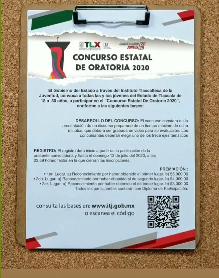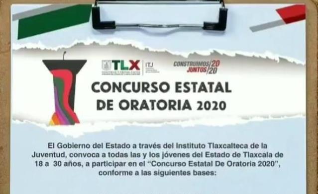 El Instituto Tlaxcalteca de la Juventud (ITJ) invita a los jóvenes a participar en el “Concurso Estatal de Oratoria 2020”, el cual tiene como objetivo reconocer el esfuerzo, trabajo y dedicación de los oradores en la entidad, así como promover la participación de este sector de la población en temas que incidan en su desarrollo.