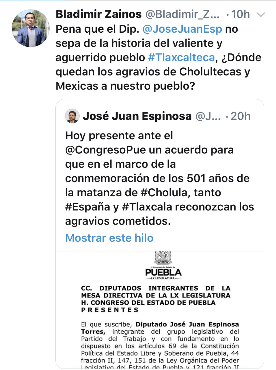 A través de su cuenta oficial de Twitter, el presidente municipal de Tepeyanco, Bladimir Zainos Flores arremetió contra un diputado local de Cholula porque el legislador pidió a Tlaxcala disculpas por los supuestos agravios cometidos contra los cholultecas antes de la conquista, pero olvidó lo sucedido con un trabajador del Ayuntamiento que acosó a una joven.