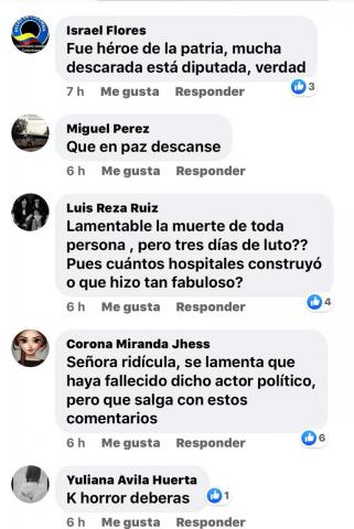 A este comentario se sumaron otros, “señora ridícula, se lamenta que haya fallecido dicho actor político pero que salga con estos comentarios”, “lamentable la muerte de toda persona, pero tres días de luto?, pues cuantos hospitales construyó o que hizo tan fabuloso”.