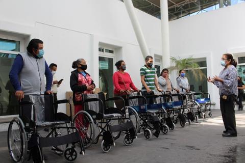 La doctora Esther Juárez Capilla, presidenta honorifica del Sistema Municipal DIF de San Pablo del Monte, realizo la entrega de 6 sillas de ruedas a familias que tienen a una persona con alguna dificultad para moverse o capacidad diferente.