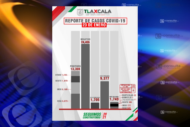De acuerdo con el reporte del 23 de enero, la Secretaría de Salud del Estado (SESA) confirmó 64 personas recuperadas, 20 fallecimientos y 57 casos positivos de Covid-19 de tlaxcaltecas identificados en el estado y 5 en otras entidades.