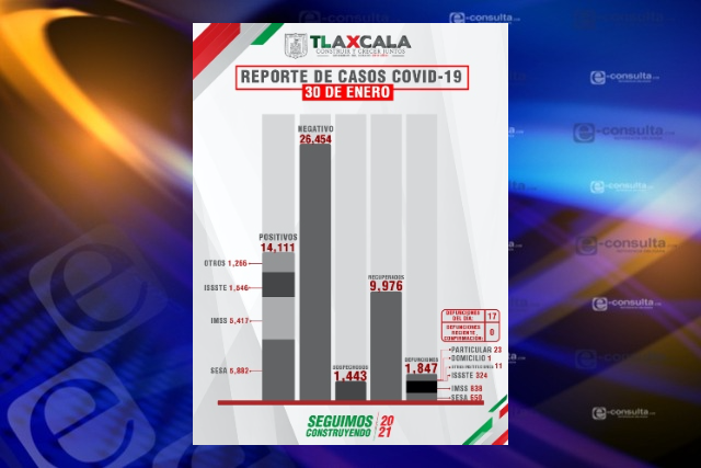 De acuerdo con el reporte del 30 de enero, la Secretaría de Salud del Estado (SESA) confirmó 60 personas recuperadas, 17 fallecimientos y 119 casos positivos de Covid-19 de tlaxcaltecas identificados en el estado y 19 en otras entidades.