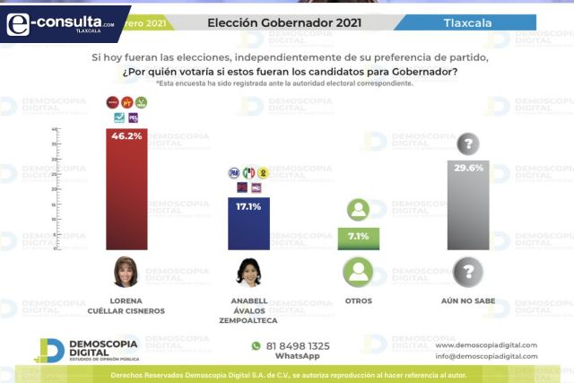 Los datos de la encuesta realizada por Demotecnia ubican a Lorena Cuéllar con el 46.2 por ciento de la intención del voto frente al 17.1 por ciento de lo que tiene la exalcaldesa capitalina, mientras que el 7.1 por ciento dijo que por otros y el 29.6 por ciento no sabe aún.