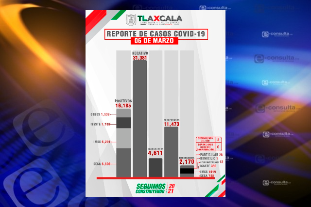 De acuerdo con el reporte del 06 de marzo, la Secretaría de Salud del Estado (SESA) confirmó 18 personas recuperadas, 5 fallecimientos y 38 casos positivos de Covid-19 de tlaxcaltecas identificados en el estado y 4 en otras entidades.