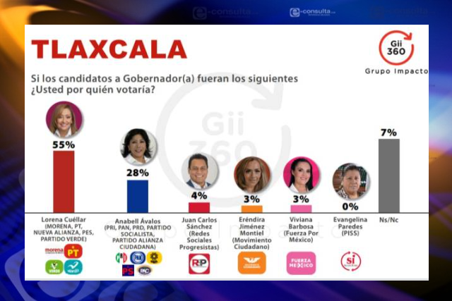Los datos de la encuesta de Grupo Impacto, colocan a la candidata de la coalición “Juntos Haremos Historia en Tlaxcala”, Lorena Cuéllar Cisneros como una inalcanzable ventaja de 27 puntos porcentuales sobre el lejano segundo lugar de la abanderada de la alianza “Unidos por Tlaxcala”, Anabell Ávalos Zempoalteca que logró tener el 28 por ciento frente al 55 por ciento de la representante morenista.