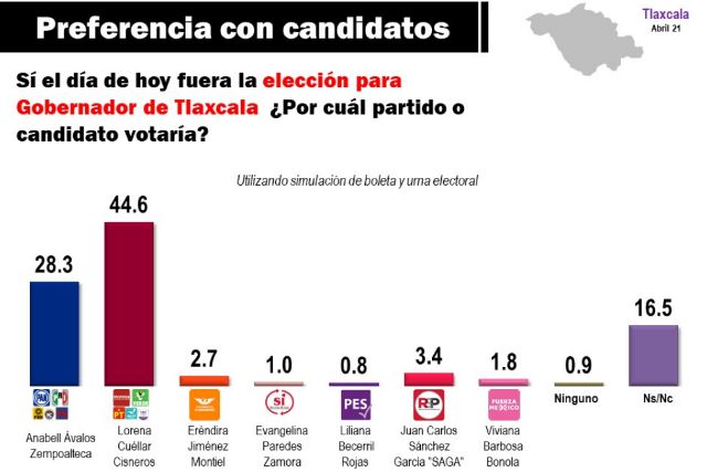 Una inalcanzable ventaja lleva la candidata de la coalición “Juntos Haremos Historia”, Lorena Cuéllar Cisneros sobre la abanderada de la alianza “Unidos por Tlaxcala”, Anabell Ávalos Zempoalteca de acuerdo con la información que proporcionó la casa encuestadora Consulta Mitofsky que da como clara ganadora a la morenista a pesar de que la priísta pagó medio de comunicación para hacer creer que iba empatando.