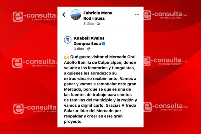 Así se expresaron los usuarios de redes sociales que reaccionaron a la publicación que hizo la candidata al gobierno de estado por la coalición “Unidos por Tlaxcala”, Anabell Ávalos Zempoalteca, la cual fue compartida por Fabricio Mena Rodríguez, candidato del PRI a diputado plurinominal y hermano del mandatario tlaxcalteca, Marco Antonio Mena Rodríguez.