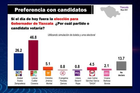 A menos de dos semanas de la elección, la candidata a la gubernatura de la coalición "Juntos Haremos Historia en Tlaxcala", Lorena Cuéllar Cisneros aventaja con casi 20 puntos porcentuales a la abanderada de la alianza "Unidos por Tlaxcala", Anabell Ávalos Zempoalteca, según el estudio demóscopico levantado por la empresa Consulta Mitofsky.