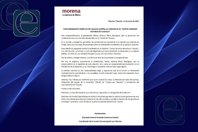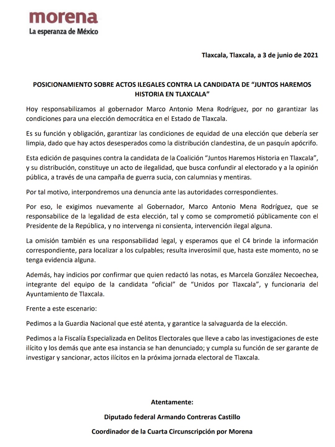 El coordinador de la Cuarta Circunscripción del Movimiento de Regeneración Nacional (MORENA), Armando Contreras Castillo señaló directamente al gobernador del estado, Marco Mena Rodríguez de ser el responsable de la “guerra sucia” que se el día de hoy se evidenció con los cientos de miles de “pasquines” que fueron tirados en diferentes municipios de la entidad para difamar a la candidata de la coalición “Juntos Haremos Historia en Tlaxcala”, Lorena Cuéllar Cisneros, quien a tres días de la elección lleva entre 15 y 20 puntos de ventaja sobre la abanderada oficialista, Anabell Ávalos Zempoalteca.