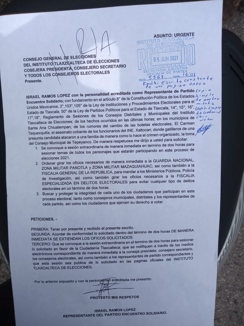 Con sello de recibido y sin ninguna respuesta, es como ha trascendido este documento, pues de parte de los consejeros del ITE la respuesta fue hacer mutis y seguir adelante sin más reparo. En el documento consta que el representante del PES, Israel Ramos López pide a través del ITE se coordinen acciones con la 23a Zona Militar, la Guardia Nacional, la Fiscalía General de la República (FGR) y la Fiscalía Especializada en Delitos Electorales (FEDE).