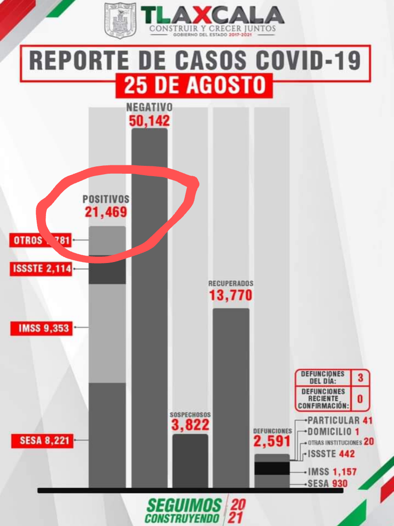Para el día 25 de agosto los contagios se ubicaban en 21 mil 469 y un día después la cifra fue de 21 mil 623, lo que significa una diferencia de 154 casos positivos de Covid-19, sin embargo, en las redes sociales en dónde diariamente se ubican las gráficas, escribieron que fueron 145 los contagios sumados entre estos dos días.