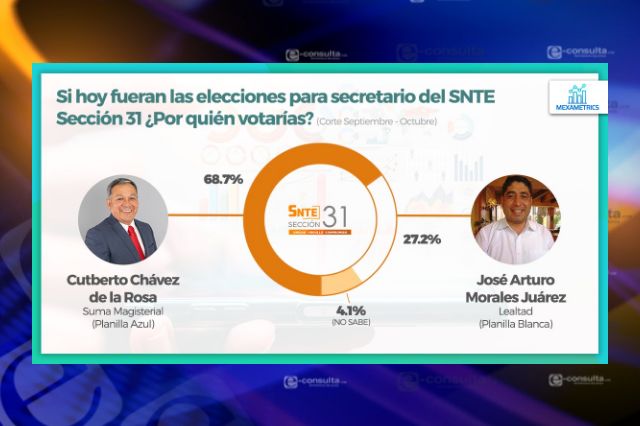 En una encuesta de una conocida empresa, Cutberto Chávez alcanza el 68.7 por ciento de la intención de apoyo entre el gremio magisterial frente al 27.2 por ciento que tiene su contrincante, Arturo Morales, mientras que el 4.1 por ciento aún no decide a quien de estas dos planillas apoyará con su voto.