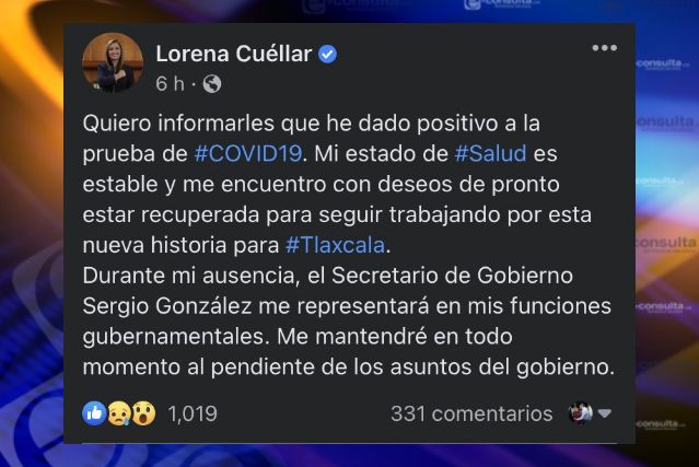 Hace unas horas a través de sus cuentas oficiales de redes sociales, la gobernadora del estado, Lorena Cuéllar Cisneros dio a conocer que tras haberse realizado la prueba de Covid-19, resultó con un resultado positivo, aunque aseguró que se encuentra estable.