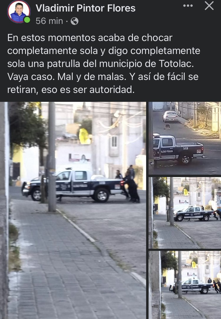 Internautas evidenciaron el mal manejo por parte de los elementos de la policía municipal de Totolac, luego de que una patrulla de la dirección de Seguridad Pública sufriera un percance la mañana de este viernes sobre la carretera que conecta a la cabecera municipal con la comunidad de Los Reyes Quiahuixtlan.