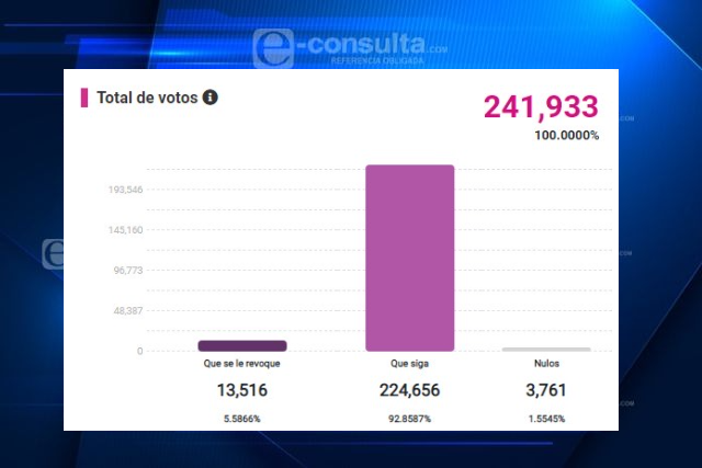 De acuerdo con los datos oficiales del Instituto Nacional Electoral (INE), el presidente López Obrador obtuvo 224 mil 656 votos para que concluya el mandato para el cual fue elegido, logrando el 92.8 por ciento del respaldo popular en los 60 municipios que conforman la geografía tlaxcalteca.