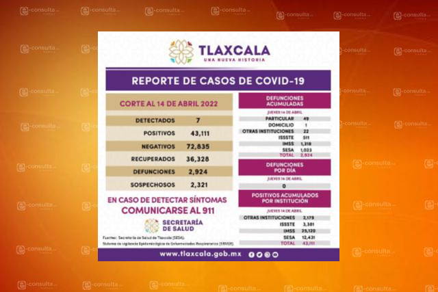 Santa Isabel Xiloxoxtla 126, Zitlaltepec 93, San Damián Texoloc 109, San José Teacalco 96, Atlangatepec 117, Santa Apolonia Teacalco 100, Sanctórum 75, Mazatecochco 77, Lázaro Cárdenas 81, Muñoz de Domingo Arenas 74, Santa Cruz Quilehtla 128, Españita 63, San Lucas Tecopilco 50, Benito Juárez 37 y Emiliano Zapata 30, datos acumulados en lo que va de la pandemia de 2020 al jueves 14 de abril de 2022.