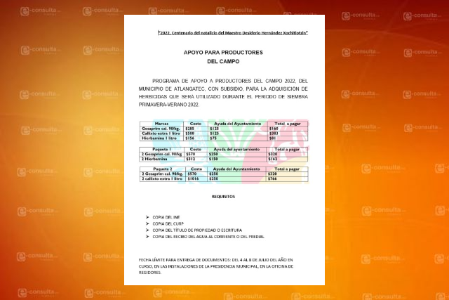 El Ayuntamiento de Atlangatepec te invita a participar en el PROGRAMA DE APOYO A PRODUCTORES DEL CAMPO 2022, con subsidio, para la adquisición de herbicidas que será utilizado durante el periodo de siembra primavera-verano 2022.