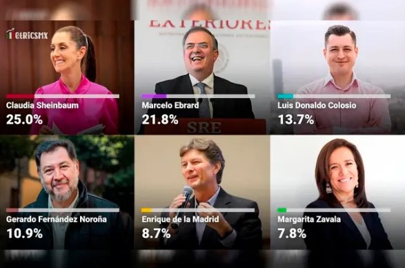 Los resultados mostraron que los candidatos con mejor opinión de la gente son Claudia Sheinbaum (26.6), Luis Donaldo Colosio (19.9), Marcelo Ebrard (17.8), Gerardo Fernández Noroña (9.2), Enrique de la Madrid (8.3), Adán Augusto López (7.8), Ricardo Anaya (6.0), Margarita Zavala (4.4).