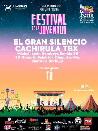 La fiesta juvenil comenzará con los DJ Demboys, posteriormente Smooth Selektor, con música Techno y House; más adelante 3D, DJ Michell León, Sonido SE, Dieguitto Mix, Nietouu Burbuja y Cachirula TBX; además de la presentación estelar de “El Gran Silencio”.