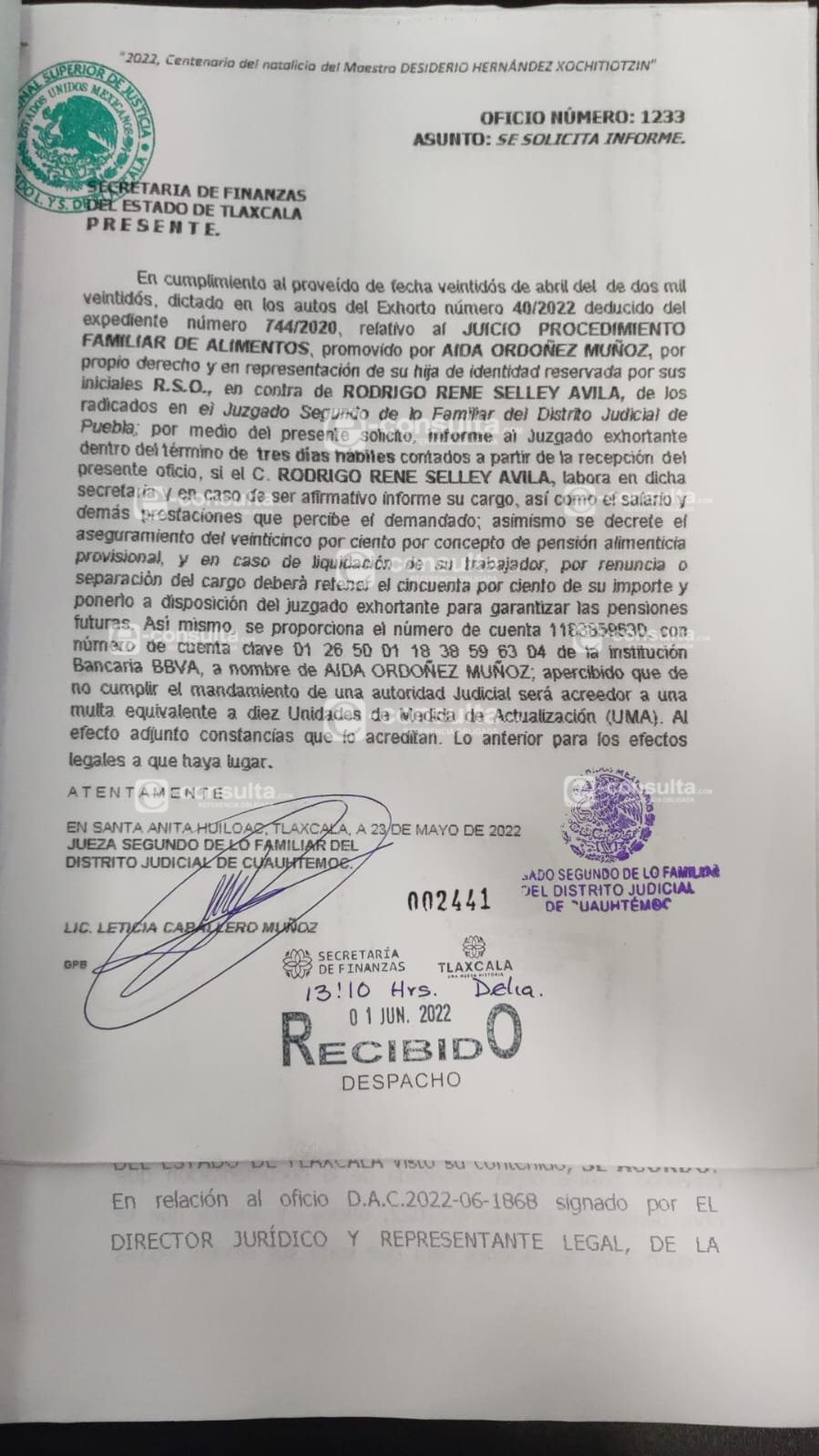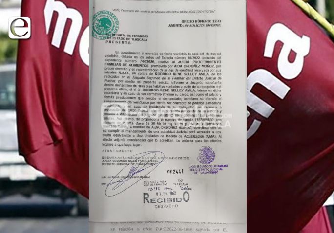 El oficio 1233 relativo al Juicio Procedimiento Familiar de Alimentos, promovido en contra de Rodrigo Selley pide que se otorgue un informe sobre el cargo y el salario que ostenta el funcionario estatal para que se le haga la deducción correspondiente y cumpla con la manutención de su hija menor de edad, sin embargo, se sabe que desde la misma dependencia y con anuencia de la OMG, se esta protegiendo al padre desobligado para no cumplir con sus obligaciones.