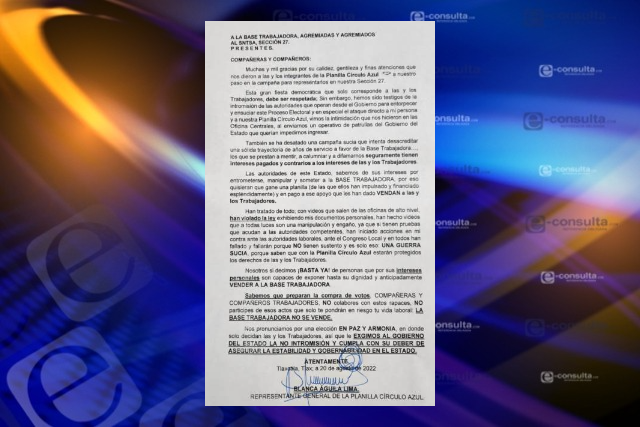 "Han tratado de todo; con videos que salen de las oficinas de alto nivel han violado la ley exhibiendo mis documentos personales, han hecho video que a todas luces son una manipulación y engaño, ya que si tienen prueba que acudan a las autoridades competentes, han iniciado acciones en mi contra ante las autoridades laborales, ante el Congreso Local y en todos han fallado y fallarán porque NO tienen sustento y es solo eso: UNA GUERRA SUCIA, porque saben que con la Planilla Circulo Azul estarán protegidos los derechos de las y los Trabajadores. Nosotros si decimos (BASTA YAI de personas que por sus intereses personales son capaces de exponer hasta su dignidad y anticipadamente VENDER A LA BASE TRABAJADORA".