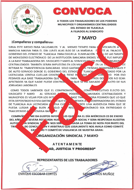 El Sindicato 7 de Mayo a través de la representación de Enrique Escobar, desmintió un comunicado que circula en las redes sociales para informar que este gremio recibirá el 25 de enero la toma de nota por parte del Tribunal de Conciliación y Arbitraje del Estado de Tlaxcala.