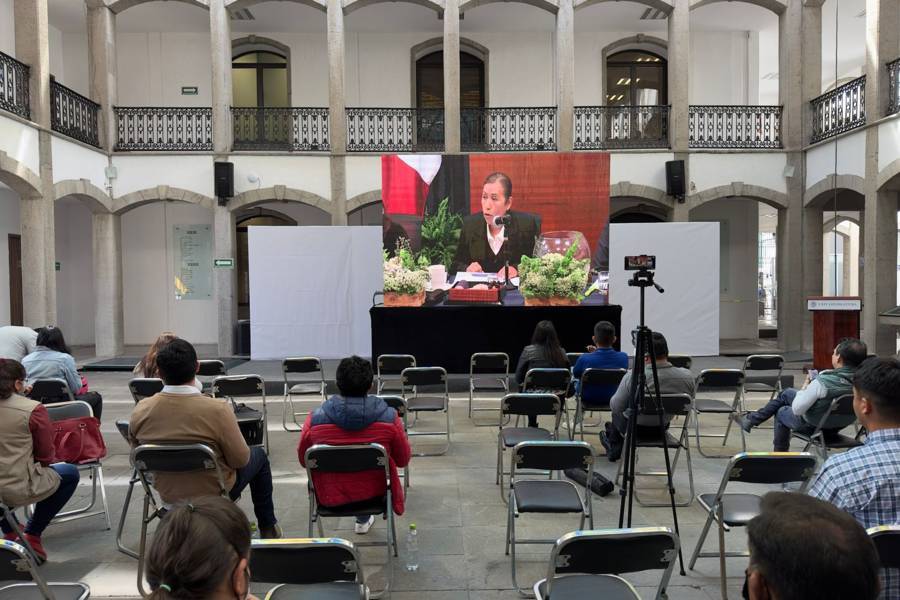 La comparecencia se realiza a puerta cerrada en el Congreso del Estado, por lo que es transmitida en el Patio Vitral del recinto legislativo.