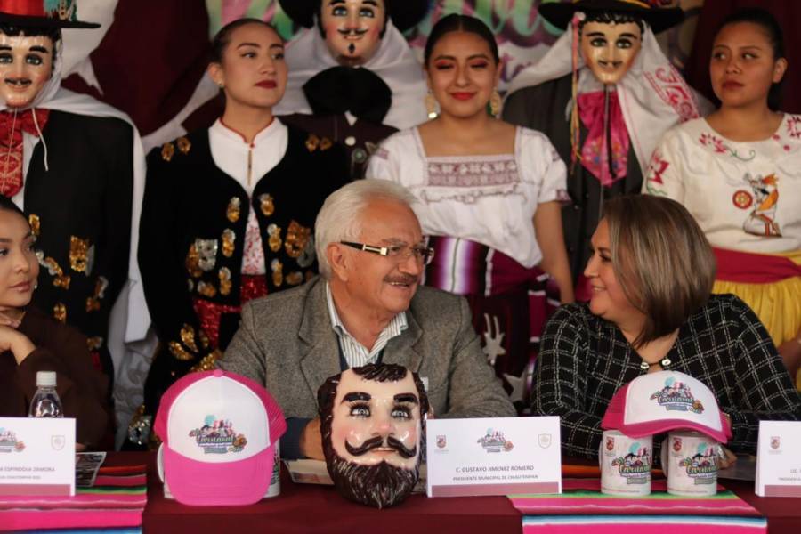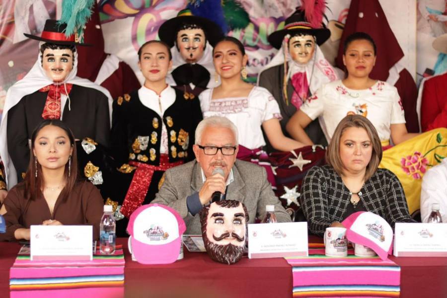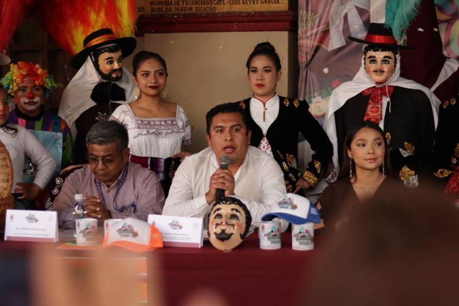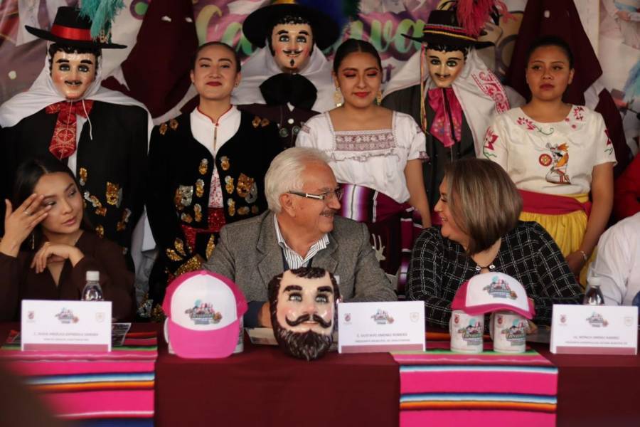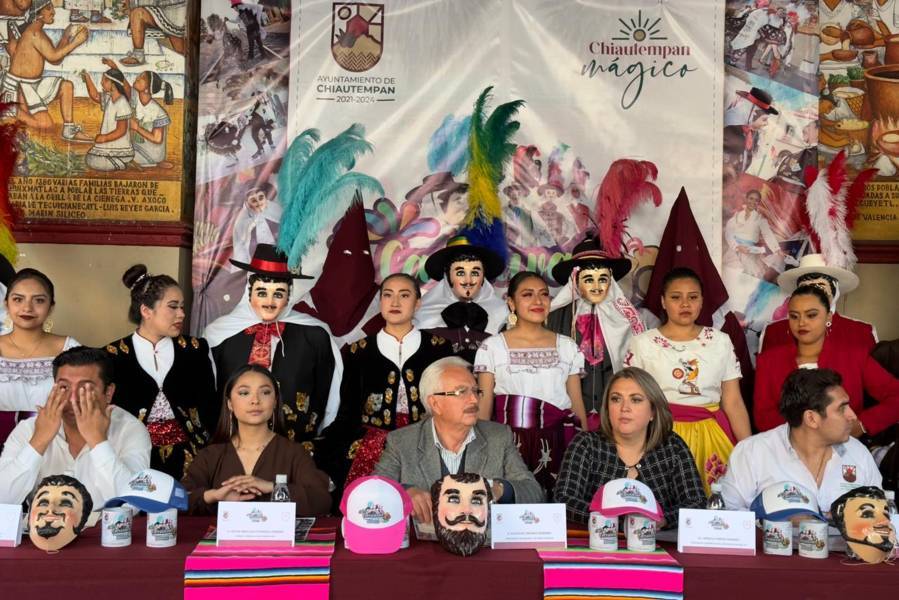 Chiautempan, Tlax.-08-febrero-2022.- El alcalde del municipio de Chiautempan, Gustavo Jiménez Romero, acompañado por Abraham Fragoso Mendoza, director de protección de patrimonio cultural, así como de autoridades representantes de las camadas; presentaron el cartel oficial del "Carnaval Chiautempan 2023", que se llevará a cabo del 17 al 26 de febrero.