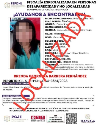 Al realizar labores de búsqueda y localización por el municipio de Chiautempan, agentes de Investigación observaron a una mujer con las mismas características fisionómicas reportadas de la persona desaparecida, por lo que se identificaron como Policías de Investigación, al tiempo de solicitarle que los acompañara ante el agente del Ministerio Público del fuero común, derivado de la denuncia que existía por su desaparición.