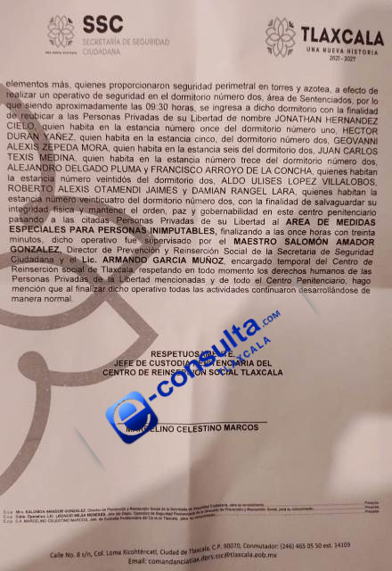 Lo anterior derivó en un urgente operativo que provocó la movilización de los custodios del Cereso de Apizaco y de distintas fuerzas del orden para garantizar la integridad física de los internos antes mencionados, el cual estuvo a cargo de Leoncio Mejía Meneses, jefe del Departamento de Seguridad Penitenciaria de la Dirección de Prevención y Reinserción Social.
