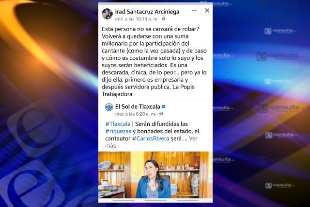 Fue Irad Santacruz Arciniega, quién a través de sus redes sociales criticó que nuevamente se haga negocio mediante la participación de Carlos Rivera, como ya sucedió con la secretaria de Turismo que se ha beneficiado económicamente de este tipo de situaciones.