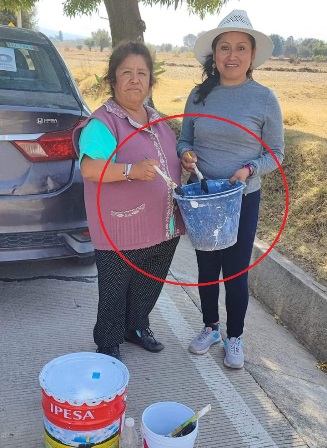 La representante de la Organización de Mujeres del Tercer Milenio, aparece con una cubeta y una brocha para demostrar su humildad cuando pinta guarniciones y banquetas.