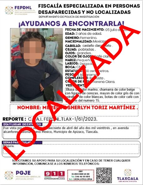 Al ejecutar labores de inteligencia, elementos policiacos de la Fepdnl localizaron a la menor en el municipio de Apizaco y posteriormente fue presentada ante el agente del Ministerio Público del fuero común.