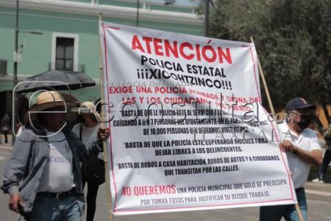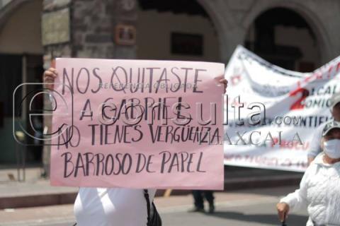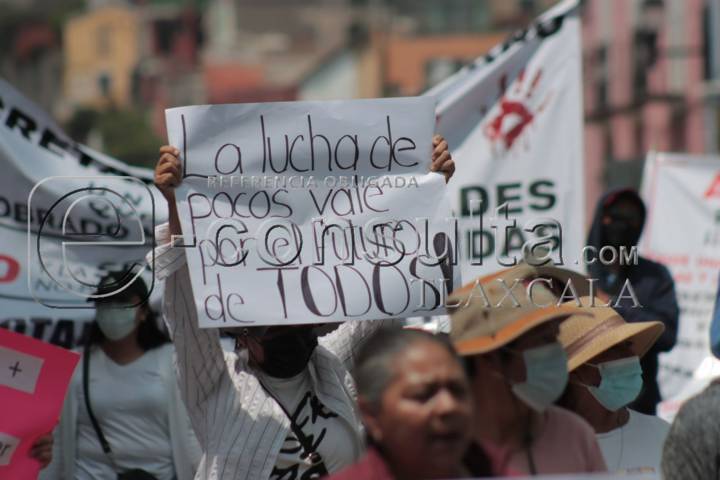 Tlaxcala, Tlax.-22-Mayo-2023. Esta mañana, un contingente de pobladores provenientes del municipio de Xicohtzinco se manifestaron en el centro histórico de la capital tlaxcalteca, para exigir justicia por el asesinato de Gabriel Rodríguez Mena, quien recibió un balazo en el estómago, el 22 de mayo de 2022, al exterior del DIF municipal; de igual manera por Fernando N. quien se encuentra postrado por ataque de arma de fuego.