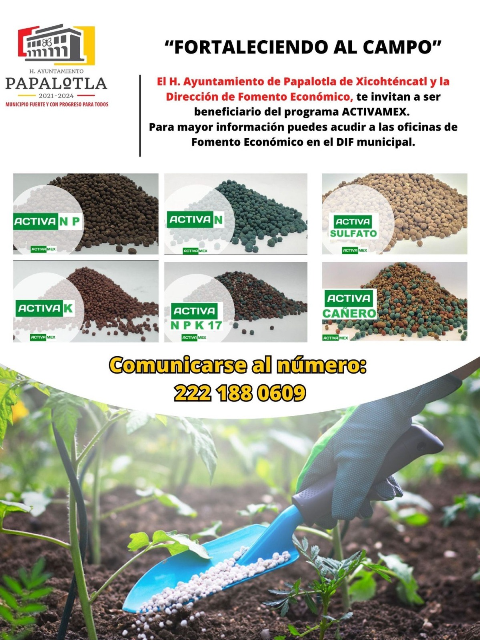 El Ayuntamiento de Papalotla de Xicohténcatl, encabezado por el Juan Octavio Rojas Cruz, en coordinación con la Dirección de Fomento Económico Municipal y la empresa ACTIVAMEX, en apoyo a los agricultores, hacen una atenta invitación para ser beneficiario del programa de fertilizantes a bajo costo.